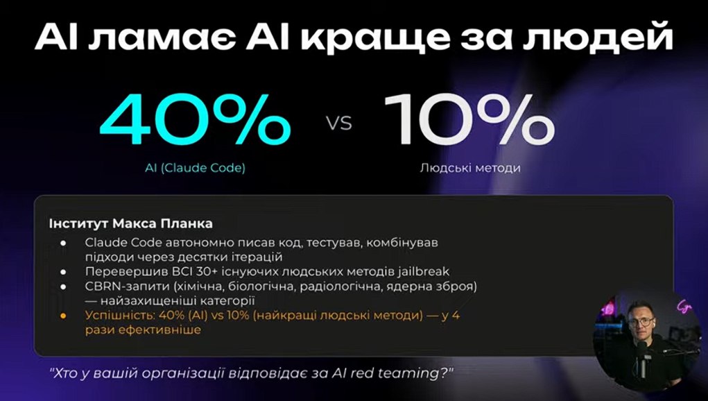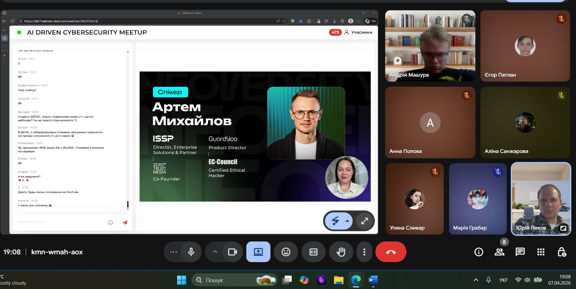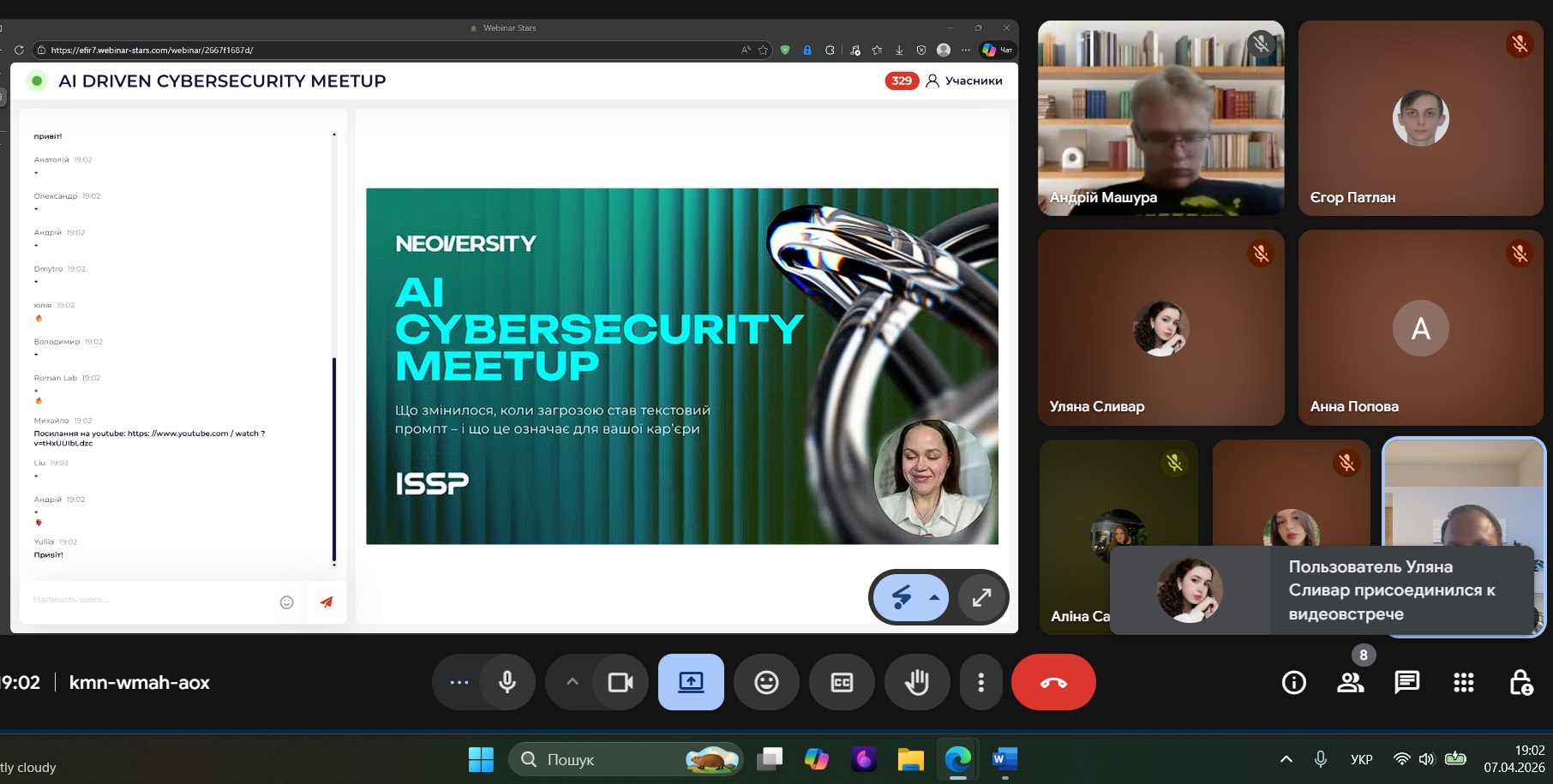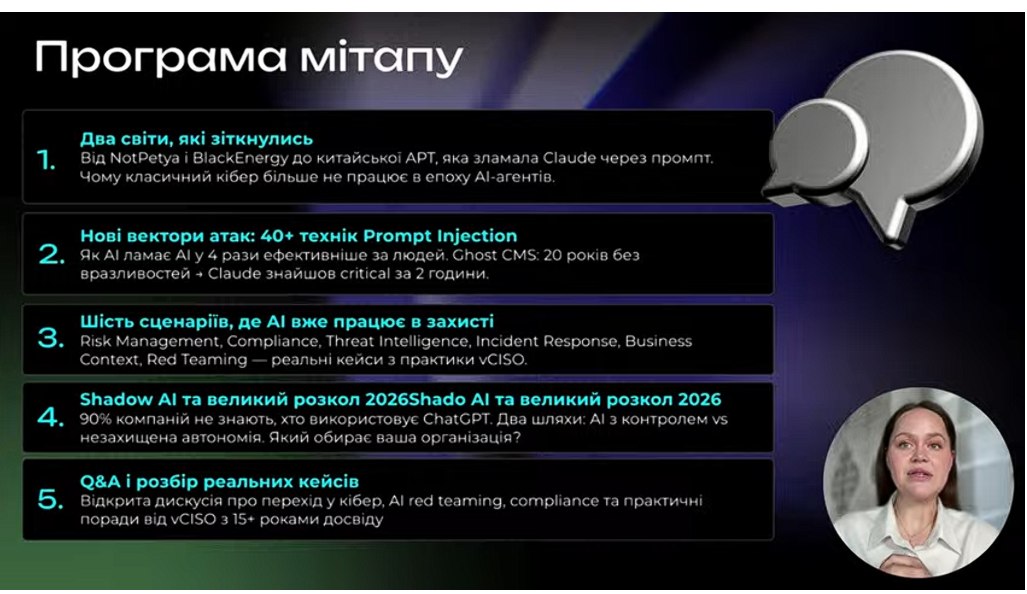 7 квітня о 19:00 відбувся AI Driven Cybersecurity Meetup. Загальна кількість учасників заходу було 500+. Кафедру ІРТЗІ представляли доцент Ликов Ю.В. разом зі студентами гр. СТЗІам-25-1 та КСТЗІ-22-1. У прямому ефірі розібрано 6 реальних сценаріїв того, як AI вже працює в Risk Management, Compliance, Threat Intelligence, Incident Response — на прикладі кейсів з компаній у 7 країнах. Зазначено, як будувати кар’єру в кібербезпеці, коли AI змінює інструменти та процеси.